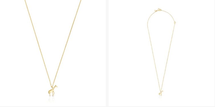 Una delicada prenda es este collar jirafa de plata vermeil Save, con placa en forma de luna, collar de 45 cm de longitud y su jirafa de 1,25 cm. En plata de Primera Ley cubierta en oro 18 Kt. Pertenece a la colección Eugenia by Tous.