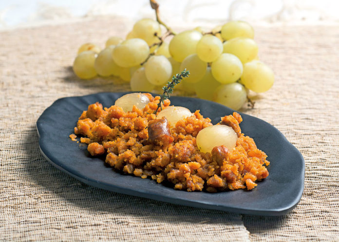 Lavamos las uvas, quitamos los rabitos y salteamos en una sartén con un poco de aceite. Después, servimos las migas y colocamos encima las uvas. Podemos decorar con un poco de perejil fresco.