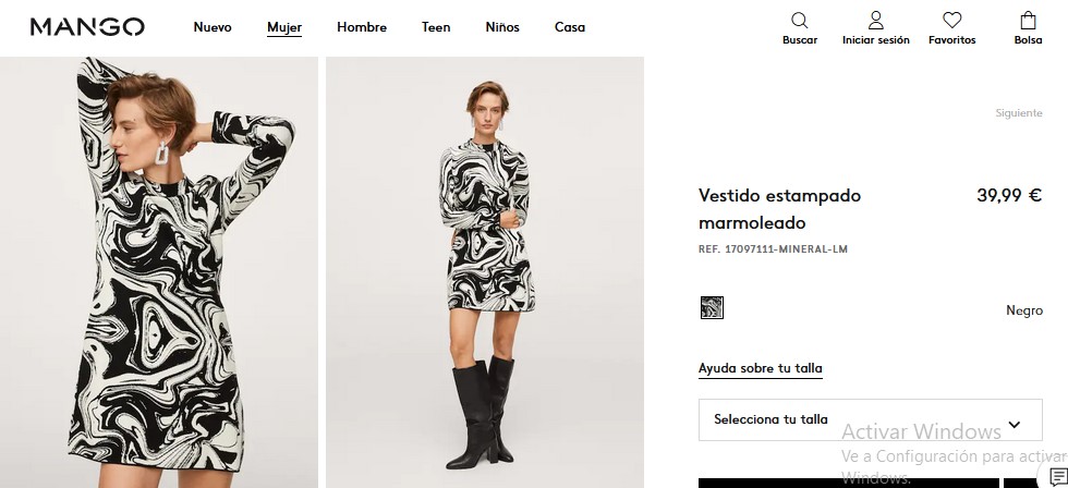 Es un increíble vestido que cuenta con un tejido de punto fino, además su diseño es corto y evasé. Para darle un estilo más moderno cuenta con un estampado marmoleado en todo su fondo. Además, el cuello es completamente Perkins y posee mangas largas, por lo que se ha convertido en unos de los preferidos en esta temporada de otoño. Para que puedan comprar este increíble vestido solo deben entrar Mango por un precio de 39,99 €.