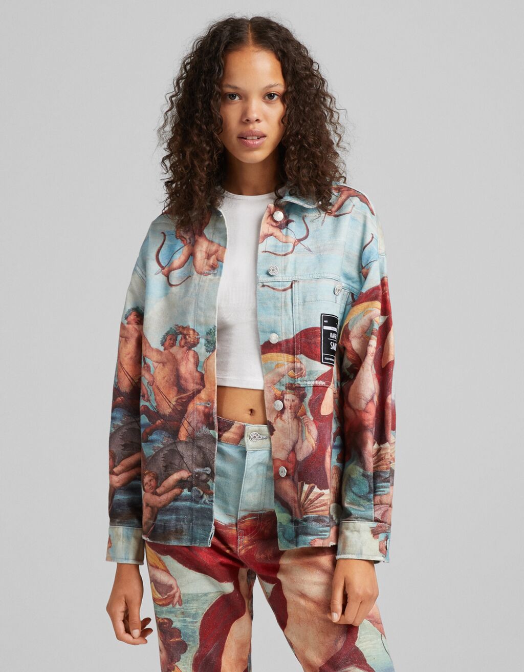 La cazadora algodón Art Serie Scala, diseñada para la dama joven de hoy, con estampado de la serie Scala, cómoda y ligera, para acompañar algún top o camiseta corta, Modélala abierta para lucir tu silueta.