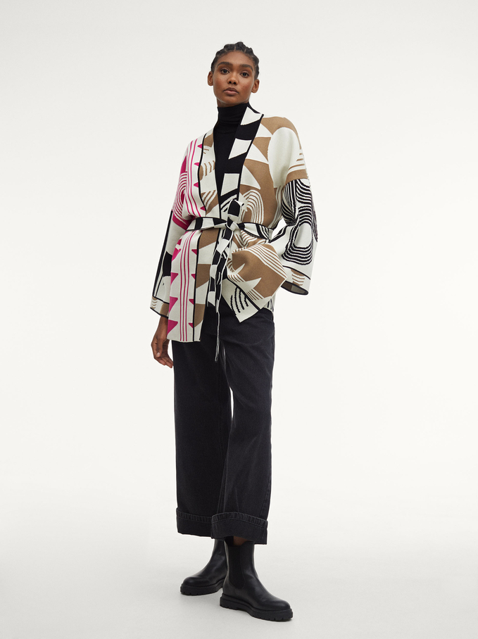 Tienes que tener en tu armario una chaqueta delicada, que en cualquier ocasión inesperada te saque de apuros, debes tener la chaqueta de punto con cinturón. Diseñada en talle largo, con un estampado espectacular sobre un color crudo.