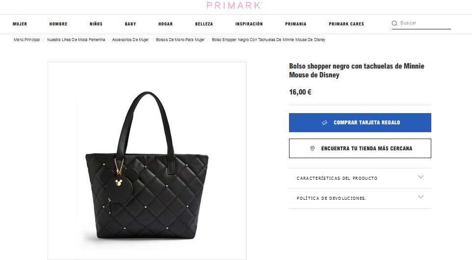 Este bolso shopper negro cuenta con un increíble diseño elegante y moderno, por lo que puede ser usado en cualquier ocasión. Además, gracias al estilo que tiene y comodidad que ofrece quedaría perfecto para llevar para los eventos de noche, por lo pequeño que es. Inclusive, cuenta con un estilo en tachuelas de Minnie Mouse de Disney. Tiene unas asas para darle esa comodidad que todas desean en sus bolsos. Para comprar este hermoso bolso deben entrar a Primark por un precio accesible de 16,00 €.