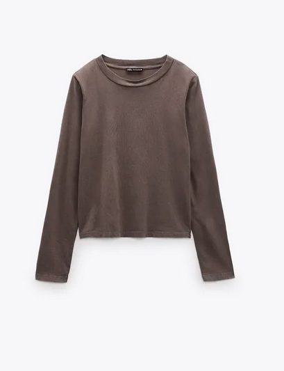 Otra de las camisetas que más rápido están desapareciendo de las estanterías de Zara es esta camiseta ajustada, de manga larga y cuello redondo con un proceso de tintado especial que hace que cada pieza sea complemente única, por eso cada una de las prendas pueden ser ligeramente distinta a las demás. Es ajustada y está disponible en color marrón, blanco y negro, perfecta para combinar con vaqueros, faldas, o para vestir debajo de otras prendas como una camisa o un jersey. Lo mejor de todo es su precio: solo 9,95€.