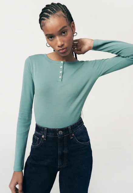En el mismo estilo sencillo, cómodo y de tejido suave, en Zara encontrarás esta camiseta de cuello redondo y manga larga, pero con un detalle de cierre frontal con botones. Ajustada y muy confortable, es perfecta para combinar con un cárdigan o una americana informal y conseguir un look estiloso para el día a día. Está disponible en color azul, blanco, beige y negro, y forma parte de la colección Join Life, que promueve la producción sostenible utilizando tecnologías y materias primas que reducen el impacto medioambiental. Encima tiene un precio realmente económico y puedes llevártela por 9,95€.