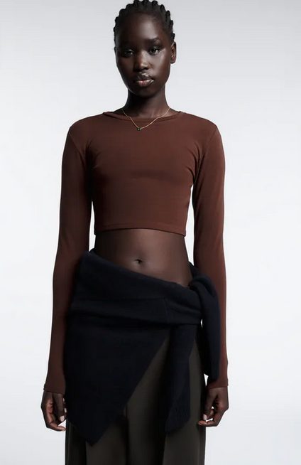 La moda crop sigue presente en las prendas de otoño-invierno, así que si no eres una persona friolera, tal vez puedas ponerte este top de Zara. El diseño es sencillo y minimalista, con cuerpo redondo y manga larga, de corte ajustado y muy favorecedor. Es suave y muy versátil, e incluso se puede superponer sobre otra camiseta a contraste si prefieres ir más abrigada y jugar con diferentes longitudes. ¿Te atreves? Está disponible en negro, marrón, rojo y blanco, y está producido con tecnologías que reducen el consumo de agua. Puede ser tuyo por solo 9,95€.