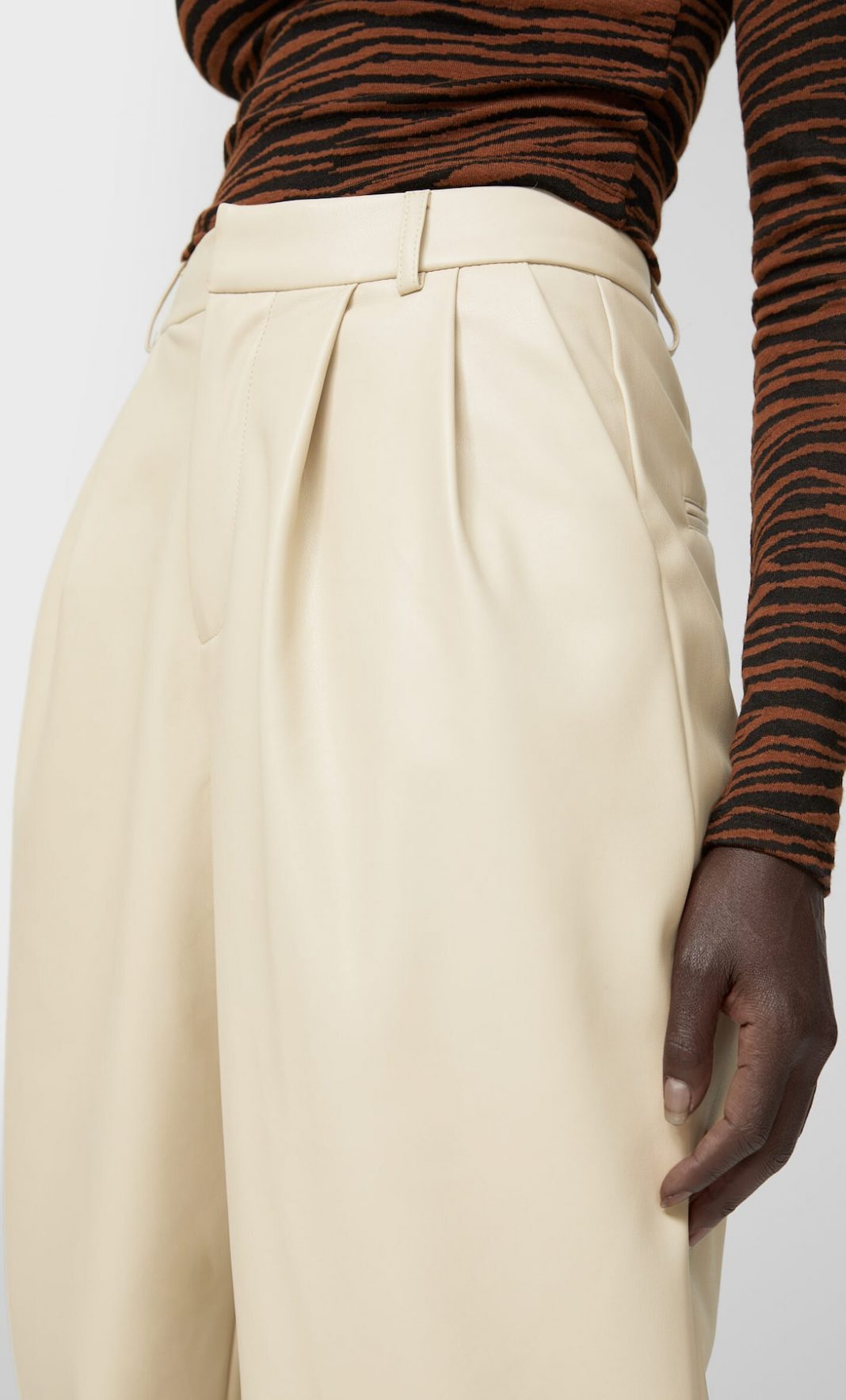 Una prenda de vestir elegante y algo formal, tienen para ti las tiendas Stradivarius con este precioso pantalón pinzas efecto piel. Con diseño de tiro alto, perneras rectas y pinzas en su parte delantera superior.
