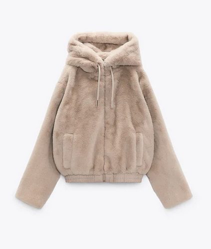 Este año las prendas de abrigo con efecto pelo están arrasando, y tendrán un gran protagonismo durante los meses de frío. Si te gusta esta tendencia échale un ojo a esta cazadora cálida y envolvente de Zara, de manga larga, bolsillos delanteros, cierre con cremallera y una abrigada capucha ajustable con cordones. El bajo tiene un acabado elástico combinado con efecto piel, y está disponible en color negro y en color arena. Está fabricado en 100% poliéster, suave y mullido, con un forro del mismo material. El precio es de 39,95€.