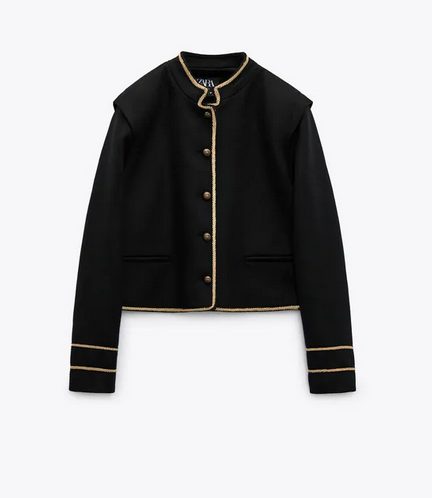 Si lo que estás buscando es una cazadora para ocasiones especiales, te proponemos esta llamativa prenda de estilo cropped, ideal para combinar con tus mejores galas. Tiene un estilo ligeramente militar, con un diseño de cuello subido y manta larga con hombreras. El resultado es muy favorecedor y elegante. En la parte delantera lleva falsos bolsillos y cierra con botones. Es de color negro y cuenta con un llamativo detalle en forma de ribete hecho con hilo metalizado en tono dorado. Está confeccionada con 8% lana, 26% poliéster, 19% acrílico, 5% poliamida y 2% otras fibras, con una gran parte de estos materiales de origen reciclado. El precio de esta cazadora en Zara es de 49,95€.