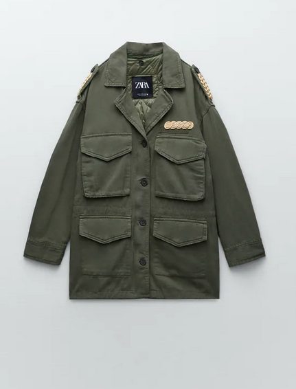 Otra prenda en tono informal y muy práctica para el día a día, es esta cazadora de color khaki que además se encuentra rebajada. Tiene cuello de solapa, escote de pico y manga larga acabada en puño y un detalle de trabilla en el hombro. Lleva amplios bolsillos de plastrón con solapa en la parte delantera y la cintura se puede ajustar tirando de un cordón interior. Cierra delante con cremallera y botones. En la parte de dentro lleva un chaleco acolchado desmontable para los días más cálidos. Su precio con descuento en Zara es de 29,99€.