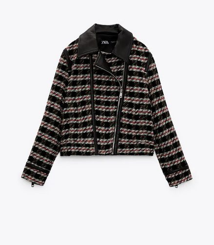 Otra de las cazadoras más llamativas y originales de Zara de esta temporada es esta prenda que combina dos tejidos, un estampado de cuadros multicolor con detalles de tejido en efecto piel. El resultado es original y capaz de aportar un plus de estilo a cualquier estilismo. Lleva cuello de solapa, y manga larga terminada con cremallera. Cierra en la parte frontal de forma cruzada con una cremallera metálica. Está confeccionada en 78% algodón, 4% acrílico, 3% poliamida, 15% poliéster, materiales en gran parte reciclados, y tiene un diseño corto, a la altura de la cintura. Te la puedes llevar a casa por 49,95€.