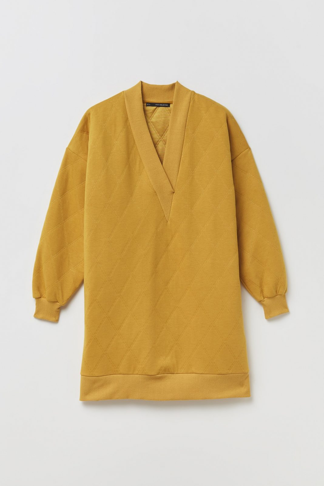 La sudadera acolchada de Sfera es una de las prendas que más están llamando la atención de la nueva colección. Es de un llamativo color mostaza, con un gran cuello pico cruzado y unas originales mangas abullonadas. El tejido es acolchado, un tipo de diseño de máxima tendencia y que hemos visto en todo tipo de complementos. Es de corte largo, por encima de la rodilla, así que puede funcionar de maravilla a modo de vestido. Está confeccionada en algodón y poliéster, y su precio es de 29,99€.