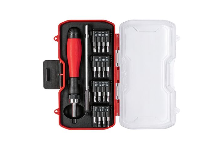 Uno de ellos es el destornillador para mecánica de precisión con llaves de vaso. Es un conjunto de 23 piezas que incluye un destornillador para mecánica de precisión con llaves de vaso con cuatro tipos de cabezales diferentes.