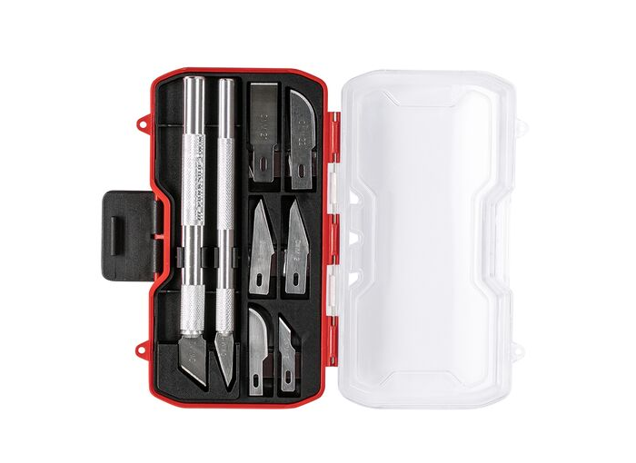 Se encuentra compuesto por un mango grande de cuchilla con hoja nº20; un mango pequeño de cuchilla con hoja nº11; y 6 hojas de precisión. Las cuchillas se encuentran fabricadas en acero al carbono.