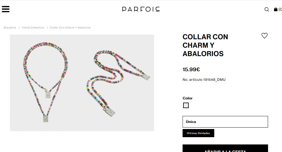 Es un collar muy peculiar por el diseño que tiene, ya que es un diseño que muchas mujeres aman. Ya que este ofrece un hermoso charm en su estilo y abalorios que son de diferentes colores. Por lo que, son perfectos para combinar con cualquier prenda que deseen por el estilo que tiende ofrecer este collar. Entonces, para comprar este hermoso collar con charm solo deben entrar a Parfois por un precio de 15.99€.
