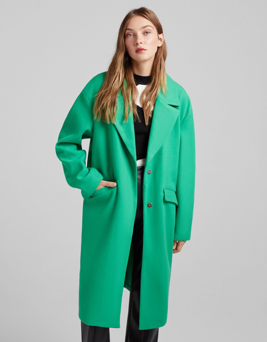 En la sección de abrigos de Bershka encontramos esta bonita prenda que nos llama la atención por su llamativo tono verde, ideal para combinar con looks en negro o con cualquier otro color neutro.