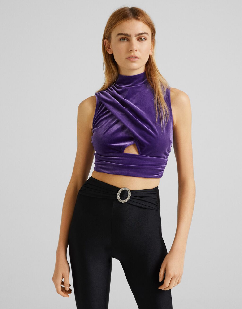 Deseas lucir agresiva, elegante y con un look especial, busca en las tiendas Bershka la Camiseta terciopelo escote drapeado. En diseño corto, sin mangas, totalmente ajustada a tu cuerpo, corte juvenil, para la ocasión donde desees destacar toda tu figura.