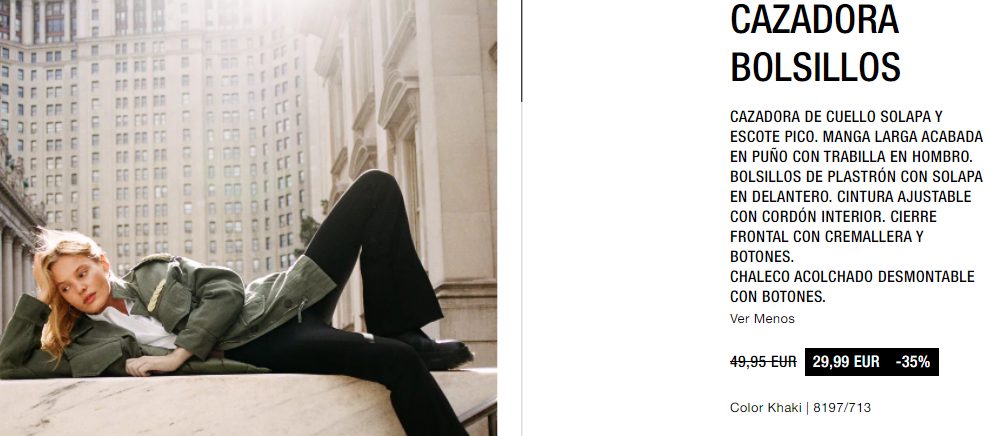 ¿Y qué te parece esta cazadora más casual? Sin dejar de ser elegante, es más convencional y sobria, con solapa y escote de pico. La manga larga acaba en puño y con trabilla en hombro. Tiene bolsillos de plastrón con solapa en la parte delantera y cintura ajustable con cordón interior. El cierre es frontal con cremallera y botones y además tiene un chaleco acolchado desmontable. Su precio en Zara es de 29,95 euros. Aprovecha porque ahora está rebajada un 35%, ya que cuesta 49,95 euros.