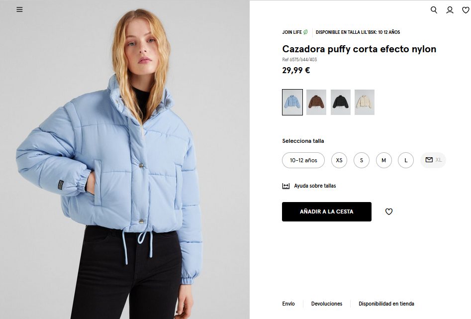 Es una hermosa cazadora azul celeste que es perfecta para usar en esta temporada de invierno. Por lo que, se ha considerado otra de las prendas preferidas de las mujeres por la comodidad que esta ofrece. Ya que, es fabricada con material de poliéster para lograr ese estilo y comodidad que toda mujer desea. Si desean comprar esta cazadora puffy solo tienen que entrar a Bershka a un precio de 29,99 €.