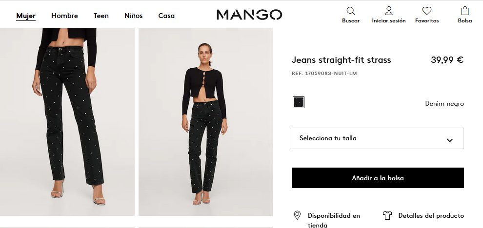 Es un jean que está fabricado en 100% de algodón y que cuenta con unos detalles de strass. Además, cuenta con un diseño recto y largo, inclusive posee tiros medio y es de trabillas. Posee cincos bolsillos para darle ese toque de confiabilidad a la prenda. Incluyendo un cierre de cremallera y botón para una mejor una comodidad. Si desean comprar este jean straight sólo tienen que entrar a Mango por un precio de 39,99 €.