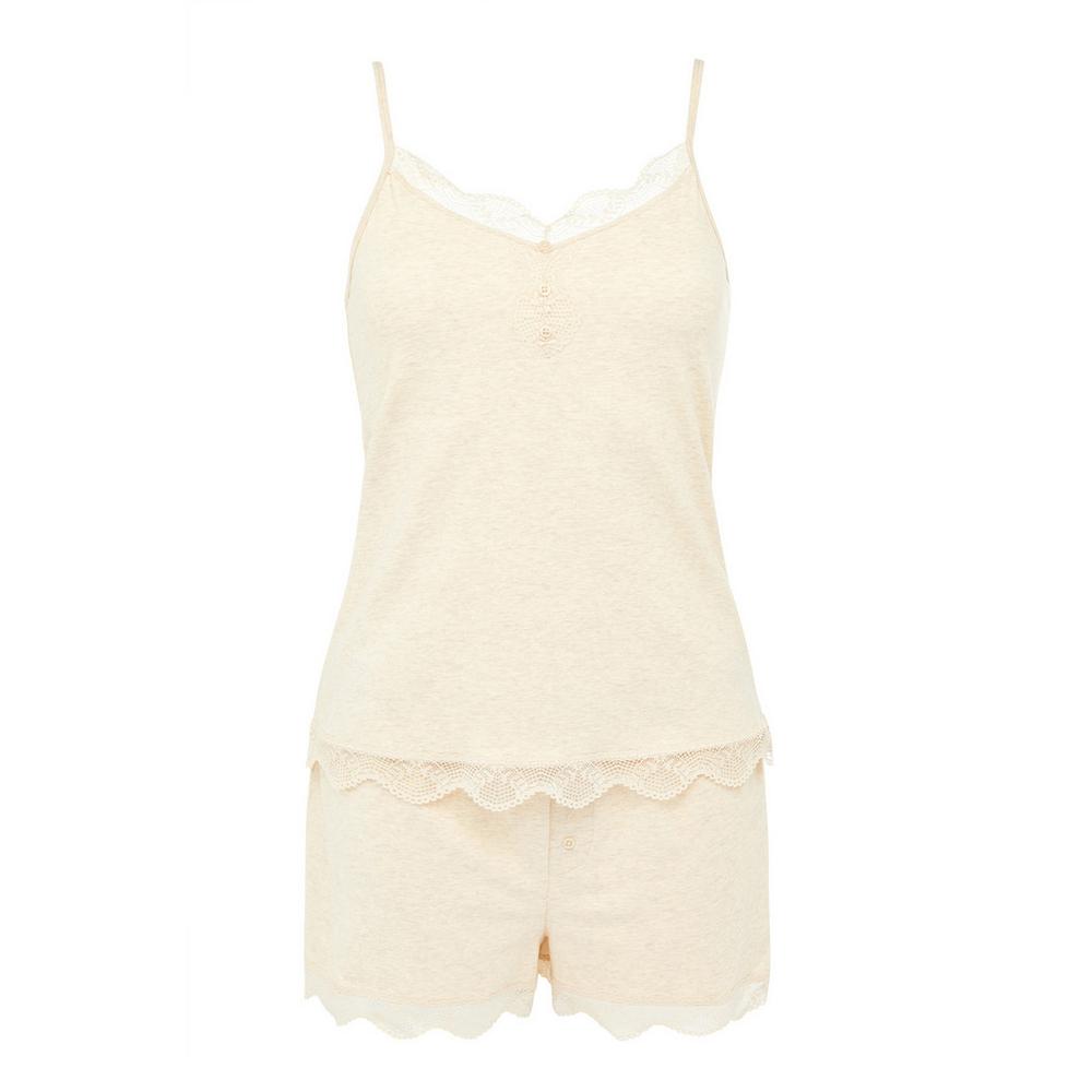 Esta pijama corto elástico de algodón color crudo, la traen las tiendas Primark para todas las damas que desean tener comodidad absoluta al descansar en la cama y muy fácil para guardar si tienes que salir de viaje.