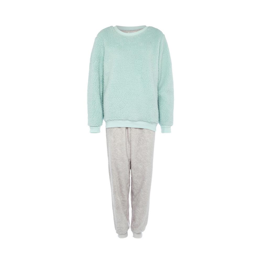 Las pijamas en dos tonos son espectaculares y más cuando la parte superior es de color diferente de sus pantalones. Así es la Pijama gris y verde menta de forro polar, para cualquier época del año.