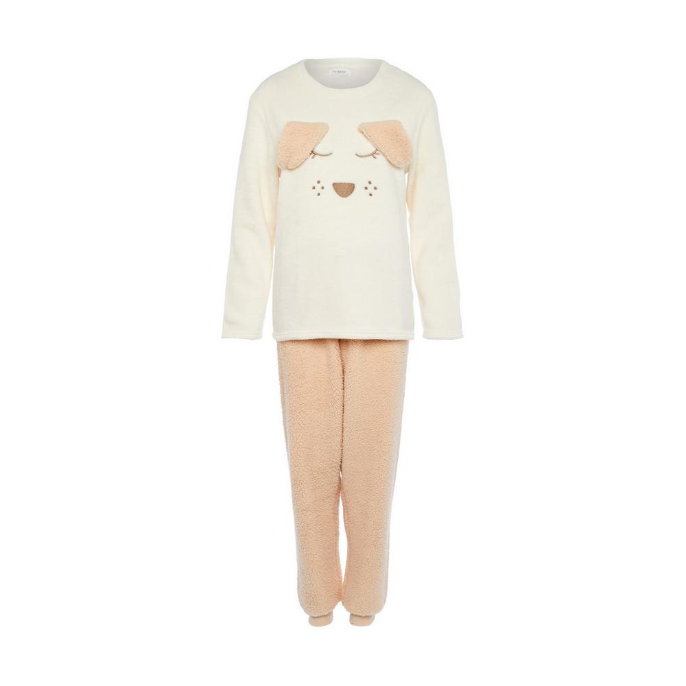 A quien no le gusta una ropa coqueta, diferente, incluso para dormir, si también tienes este gusto busca la Pijama beige de forro polar con conejito bordado, bastante abrigada que puedes llevar a la cama con comodidad en este invierno.