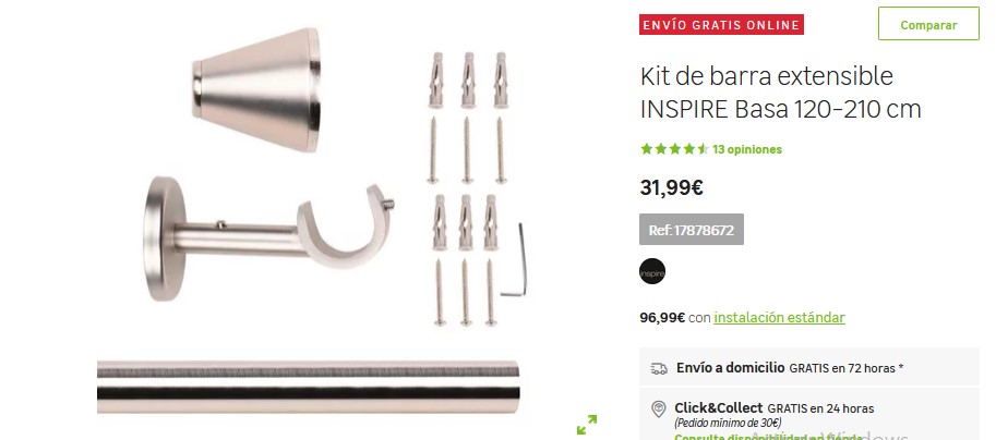 Con estos tipos de kit se puede colocar fácilmente cualquier tipo de cortinas en la estancia, sin tener que tener miedo a equivocarnos con las medidas. Cuenta con un diseño perfecto, en la que se puede colocar aquellos diseños que más nos guste. Que espera adquirirla por la plataforma web de Leroy Merlín por tan solo 31, 99 euros.