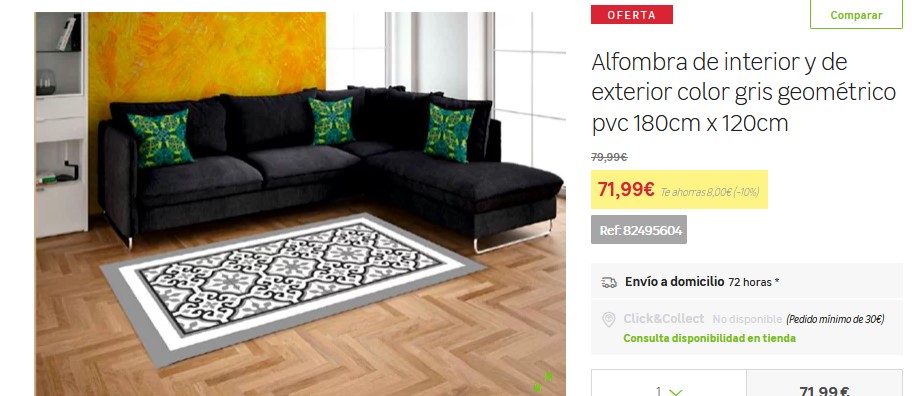 Es una alfombra vinílica de PVC de modelo Hakuna, además de color gris Cenefa que cuenta con un diseño de motivos geométricos. Por lo que, es perfecta para decorar las estancias interiores y exteriores protegidos, como es el caso de los porches o terrazas. Además, cuenta con bases antideslizantes, permite que se mantengan siempre en la misma base y evitar los resbalones. Además, son fáciles de limpiar, con solo usar agua y jabón, sin tener que usar productos especiales. Entonces, la puedes adquirir por Leroy Merlín aun precio accesible de 71,99€ en diferentes medidas.