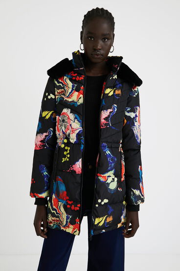 Este abrigo de Desigual está diseñado por Mr. Christian Lacroix, que ha decidido incorporar unas notas de color a un abrigo largo, acolchado, con una capucha extraíble con forro interior efecto pelo. El fit es regular, lleva cuello alto y cierre de cremallera, y dos bolsillos laterales también con cremallera. Está fabricado en poliéster de color negro con estampado arty colorido. El precio de este cálido y mullido abrigo acolchado es de 199,95 €.