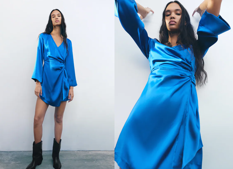 Una última recomendación es este vestido satinado cruzado, un vestido corto con escote pico cruzado y manga larga ancha que se encuentra a la venta en Zara por un precio de 29,95 euros y en color cobalto.