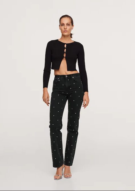 Imposible no incluir adicional a los vestidos, este Jeans straight-fit strass, al verlo en las tiendas Mango quede enamorada de él y quise compartirlo con ustedes. En color denim negro, con destalles de strass, en tiro medio y diseño largo.