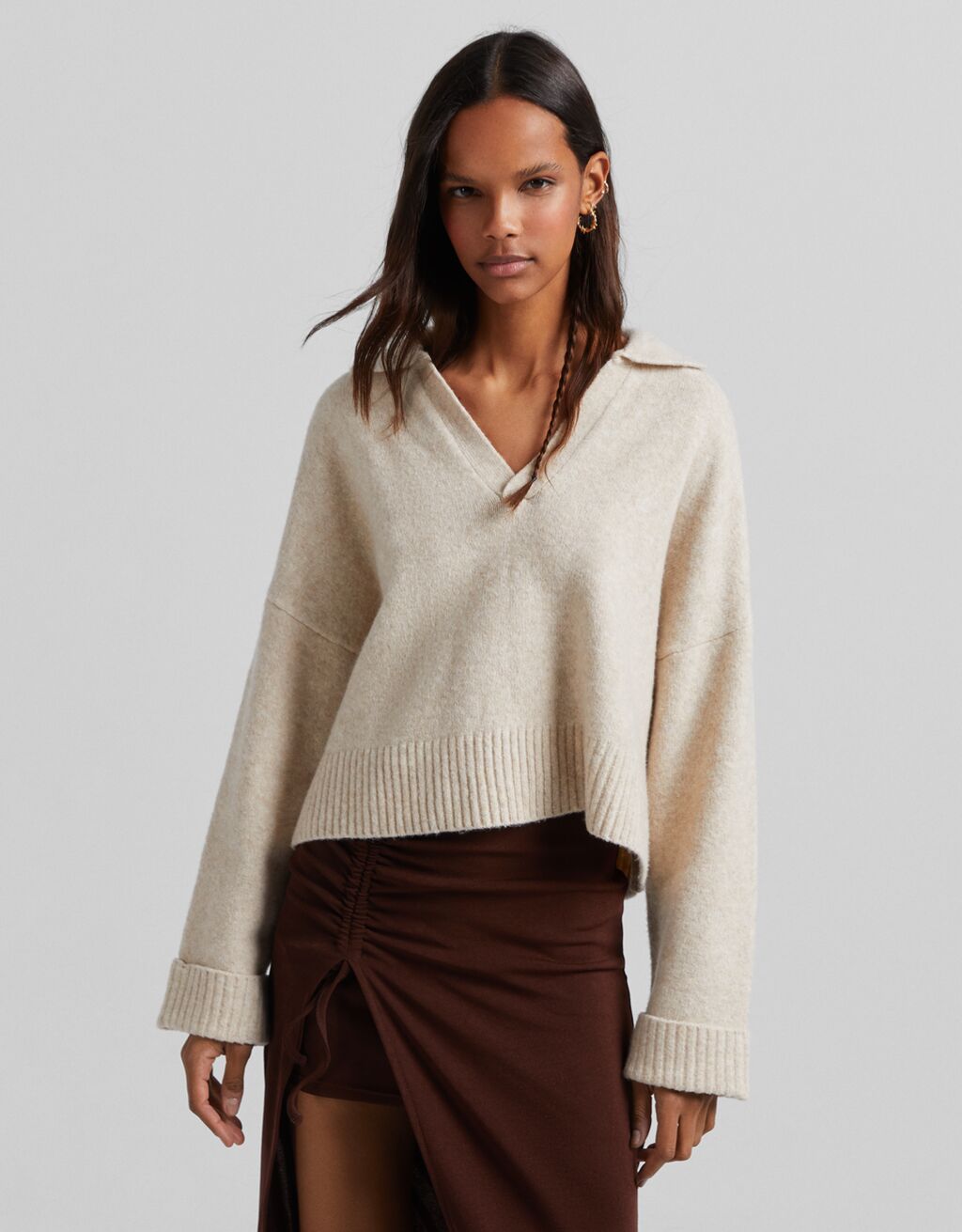 El Jersey ancho cuello polo que tienen las tiendas Bershka, es una prenda juvenil y delicada para modelarla donde lo desees. Su cuello polo permitirá que luzcas algunos de tus coloridos collares y preciosos pendientes.