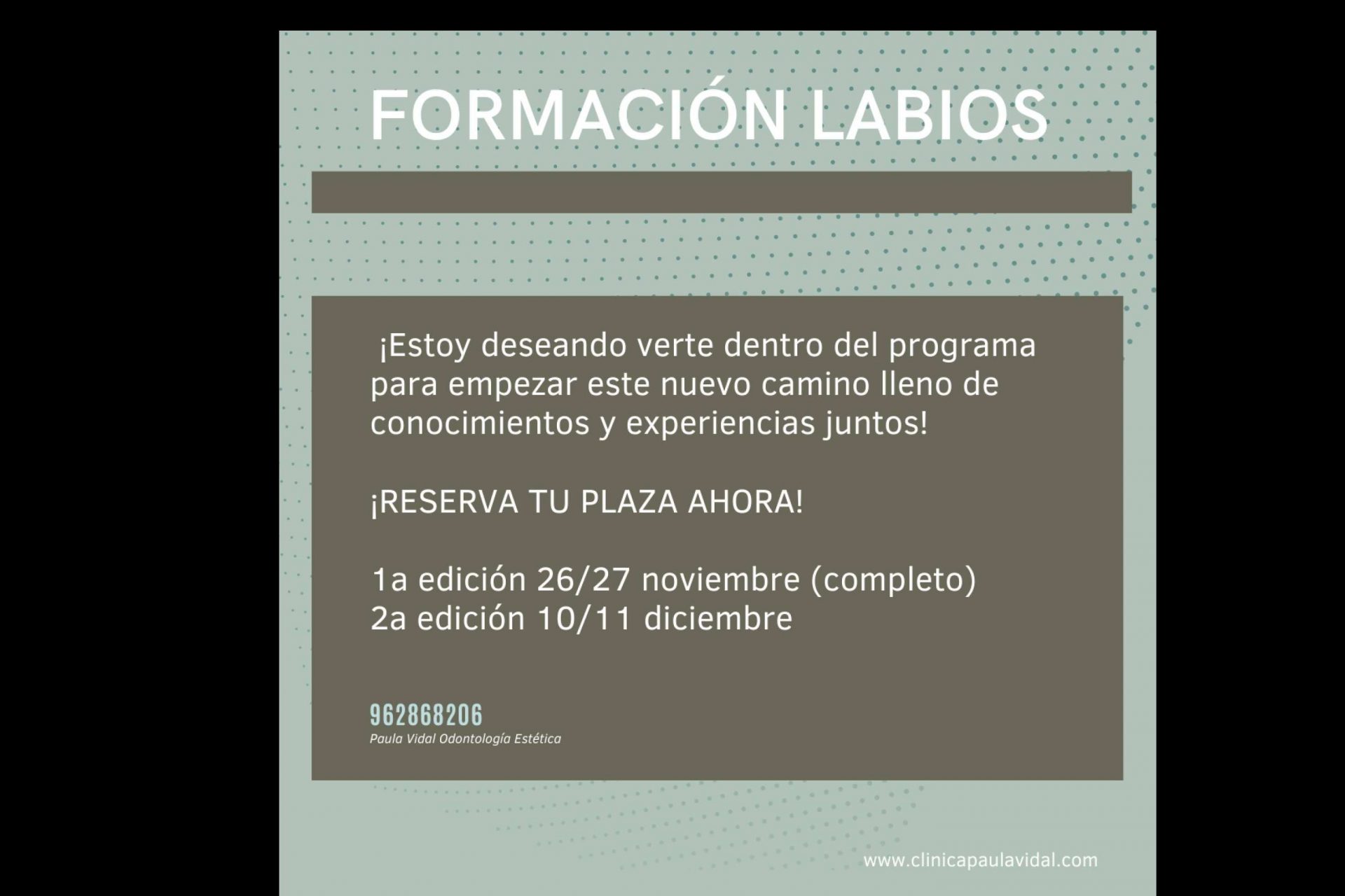 La Clínica Dental Paula Vidal ofrece para el viernes 10 y sábado 11 de diciembre del presente año un curso para odontólogos de relleno de ácido hialurónico, para aprender las técnicas más novedosas de infiltrado de labios.