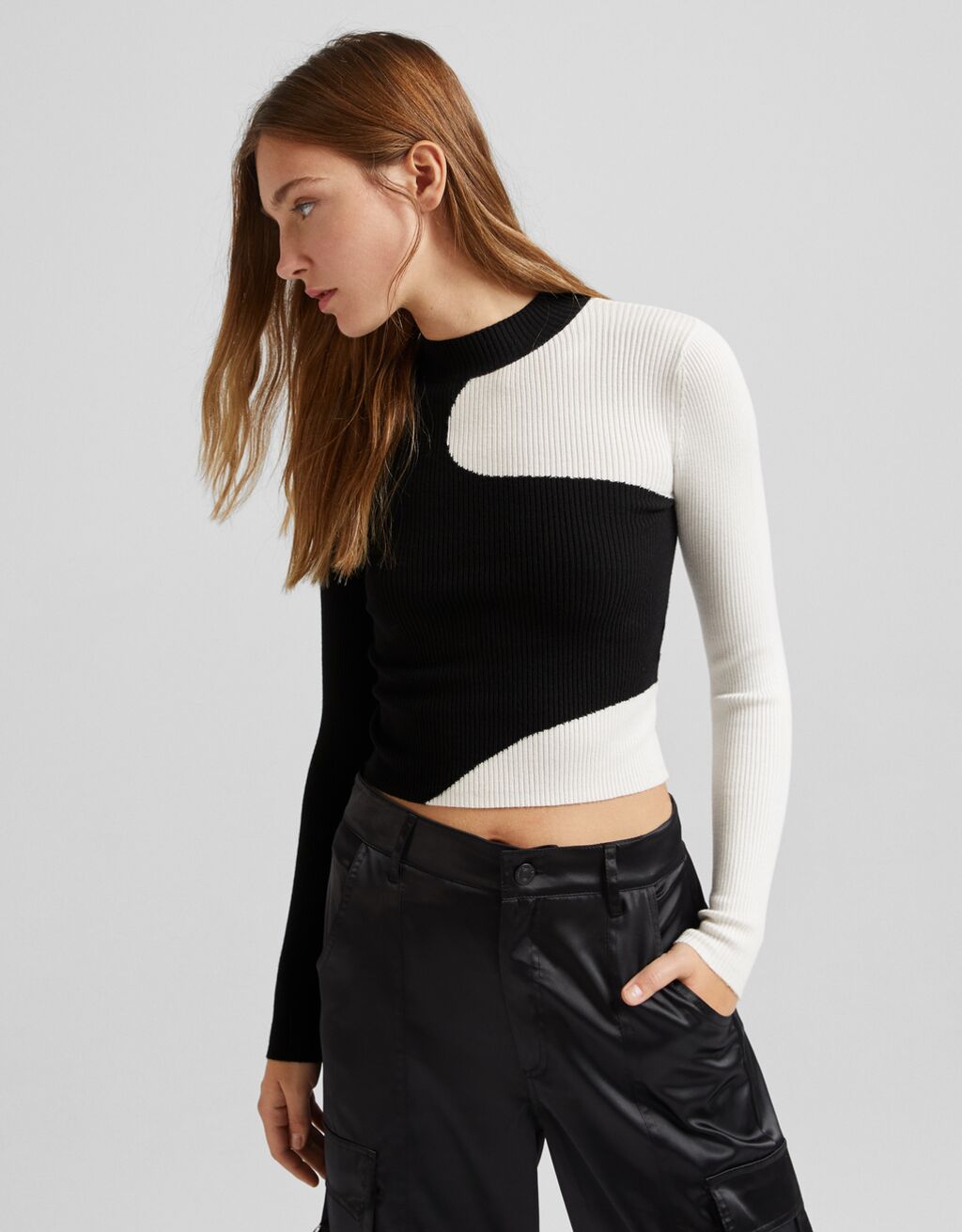 A pesar de que los tonos básicos y clásicos siempre son un acierto, eso no significa que deban ser aburridos. Un buen ejemplo lo tenemos en este jersey bicolor de Bershka.