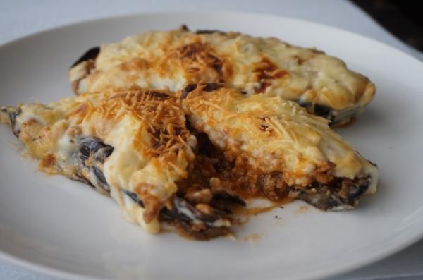 Primero se debe de colocar un poco de soja texturizada para que se hidrate. Después, las berenjenas picadas por la mitad, se deben de colocar en el microondas unos 10 minutos hasta que se ablanden. Muchos dejan las pieles de las berenjenas para ser rellenada con la salsa de bechamel. Después, se procede a sofreír una cebolla, pimiento rojo y verde, para luego añadir la soja hidratada.