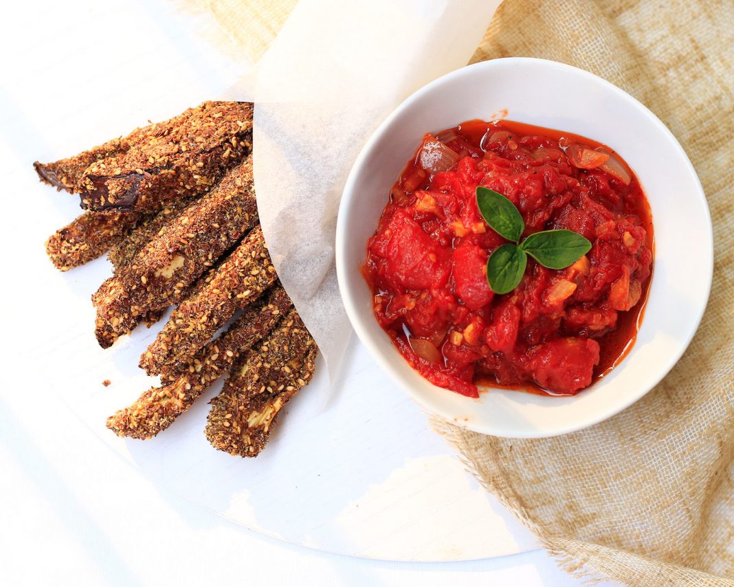 Los ingredientes que se usan en esta receta son una berenjena grande, huevos, anacardos picados, cilantro, sal y pimienta. Posteriormente deben de encender el horno a 200ºC, se cortan las berenjenas en bastones, para que sean pasados por los huevos batidos. Luego se deben pasar las berenjenas mojadas con el huevo por la mezcla realizada de anacardos y se deben hornear hasta que se horneen.