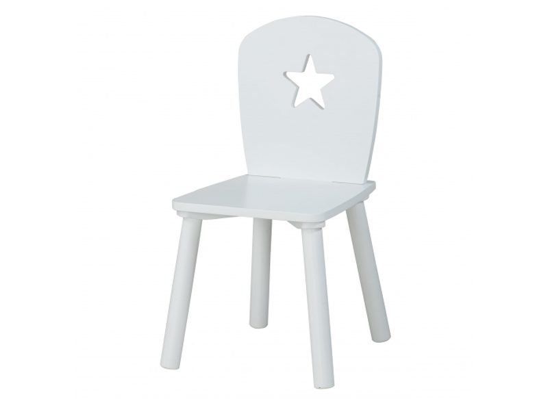 Es una silla infantil que posee en el respaldo una estrella, estando fabricada en madera y con unas dimensiones de 60 x 29 x 29 cm. Se trata de un tipo de asiento fijo, con un acabado en color blanco.