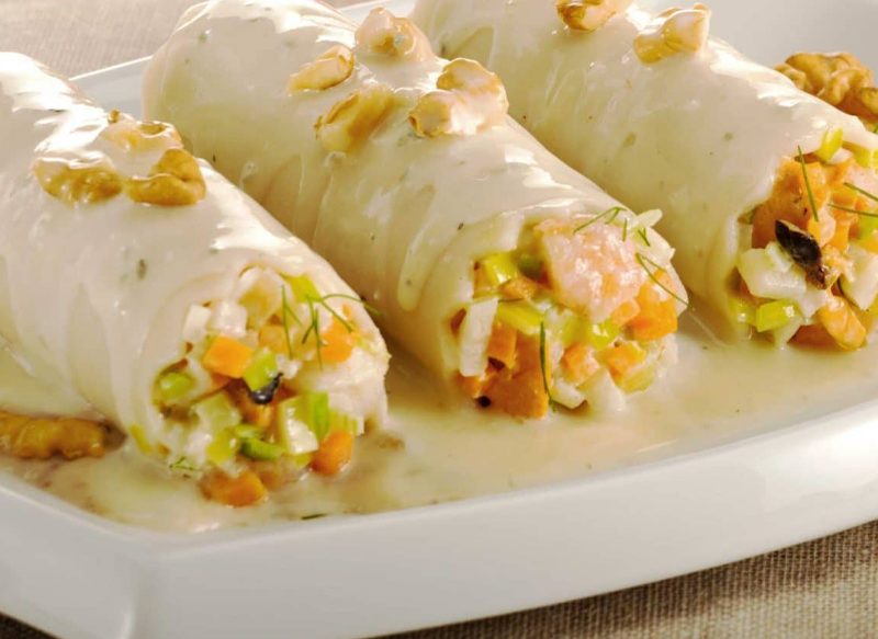 Remueve todo ello para evitar que se pueda pegar. Cuando esté lista la salsa y esté espesa, habrá que coger las láminas de pasta y rellenarlas, formando así los canelones de marisco para Navidad. Antes de introducir los canelones enrollados en el horno, tendrás que engrasar la fuente con un poco de aceite para evitar que se puedan pegar.