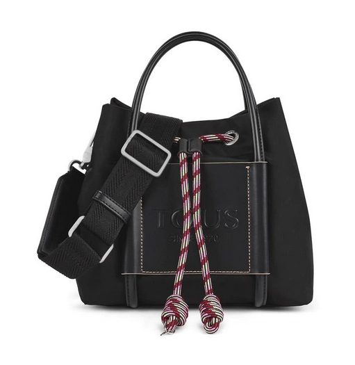Por último, traemos un diseño de la conocida marca Tous, un modelo en piel negro, con asa de bandolera pensado para el día a día, con un estilo informal y práctico. Es de nylon reciclado en color negro y cierra con un cordón ajustable de colores. Además, incluye unas asas de mano y una correa larga ajustable y extraíble. Tiene dos bolsillos exteriores planos y bastante capacidad interior. Las medidas son 12,5 x 23 x 20 cm. y su precio en El Corte Inglés es de 119 €. Si te gusta, lo puedes conseguir aquí.