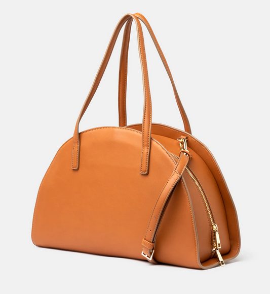 Otra pieza original que enamora a quien lo ve, es este bolso de mano de la firma Gloria Ortiz con una bonita forma de media luna. Lleva dos asas medias y un detalle de aplique metálico de la marca. Cierra con cremallera y cuenta con dos bolsillos interiores uno de ellos con una práctica cremallera. Es amplio, práctico y perfecto para cualquier ocasión. Está disponible en varios colores aunque su versión en camel es quizá la más llamativa. Mide 15 (ancho) x 37 (fondo) x 23 (alto) cm y lo tienes en El Corte Inglés por 84€. Aquí te dejamos el link.