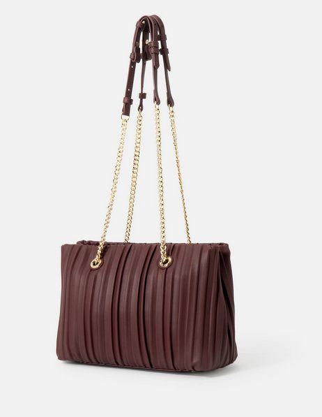 El bolso de mano es la elección perfecta para un look festivo como todos los que vienen en estas fechas. La firma Gloria Ortiz nos ofrece este modelo en color burdeos, con un detalle de placa dorada grabada con la marca. Lleva dos asas de cadenas en color dorado que le da el punto sofisticado y elegante. Tiene un cierre de broche y cuenta con tres bolsillos interiores para una organización perfecta. Las medidas son 13 (ancho) x 31 (fondo) x 24 (alto) cm y lo puedes conseguir en El Corte Inglés por 84€. Este es el enlace.