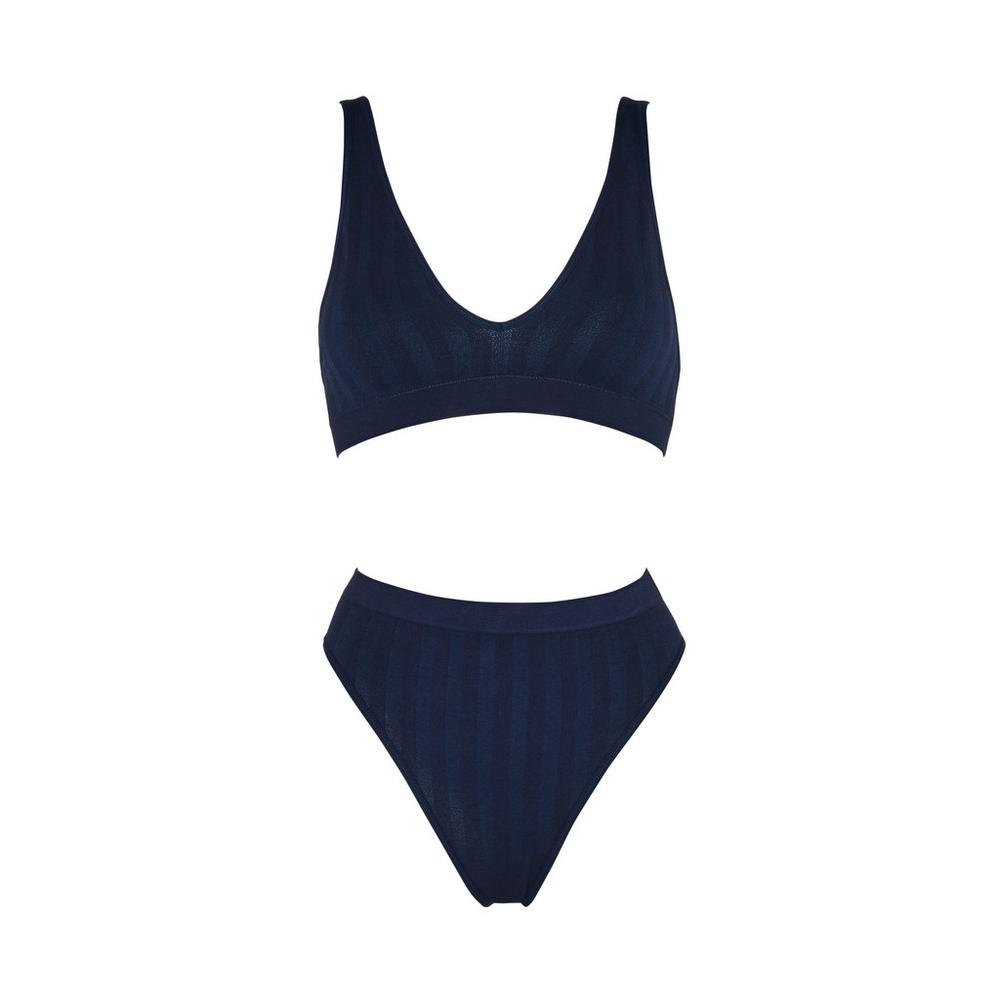 Dentro de su línea Wellness, en Primark encontramos este bonito conjunto en tono azul marino a rayas, sin costuras, para un extra de comodidad. Su precio, de tan solo 8 euros, nos parece lo más interesante.