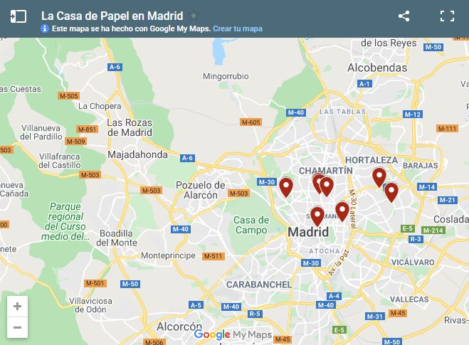 Los fans de la serie puede hacer la ruta de todos los lugares que hemos visto, porque además en están en un radio relativamente cómodo de Madrid, y en cuanto a las otras ubicaciones españolas, están cerca, en el provincia madrileña o en la segoviana. Quedarían al margen las localizaciones exóticas de Asia y las de Italia. En el mapa que ves están las principales ubicaciones del rodaje de ‘La casa de papel’.