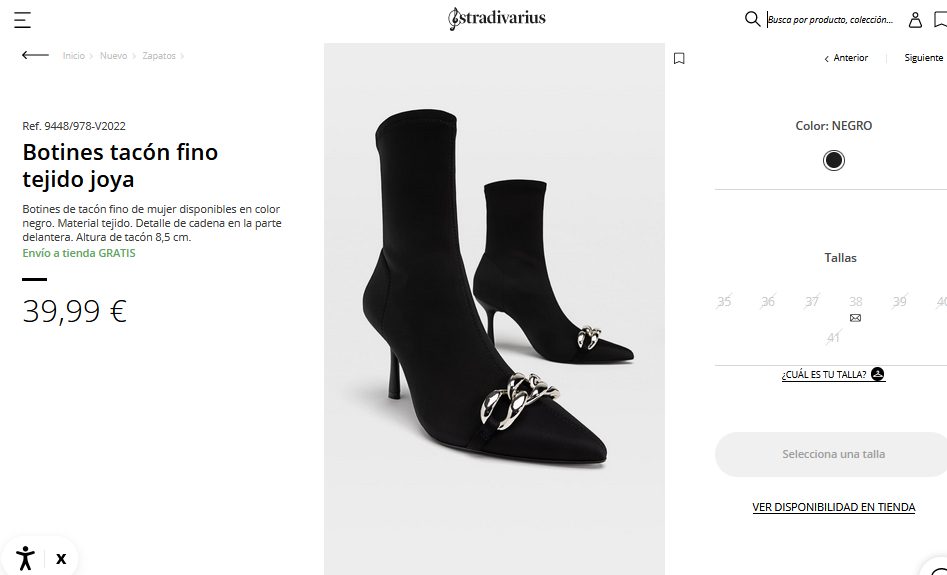 Son unos hermosos botines de tacón fino de mujer que se encuentra disponibles en color negro. Además, son súper cómodos dado que está hecho de material tejido para lograr ese estilo cómodo que ofrece. Inclusive, tiene unos detalles de cadena en la parte delantera para lograr ese estilo perfecto y la altura del tacón es de 8,5 cm. Si desean comprar estos botines solo tienen que entrar a Stradivarius por 39,99 €.