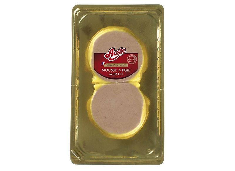 La marca Aoste está detrás de este mousse de foie de pato, el cual se puede encontrar a la venta por 3,49 euros por un formato de venta de dos medallones de 100 gramos cada uno. Tras la marca se encuentra la firma Campofrío.