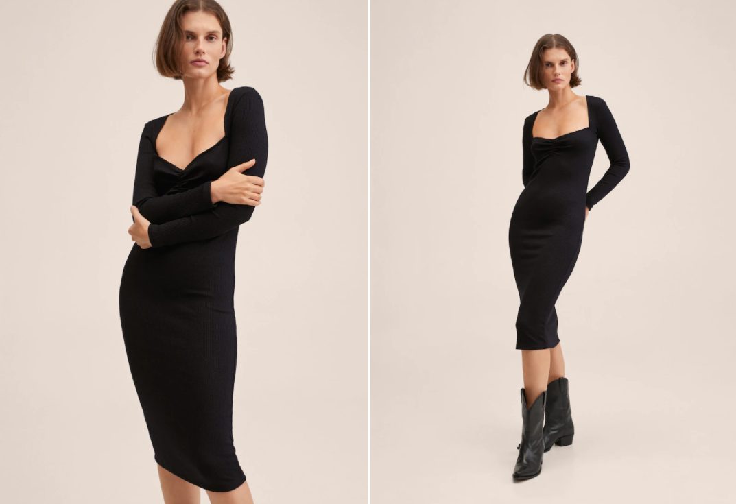 3Vestido negro con escote fruncido de Mango, un básico en tu armario
