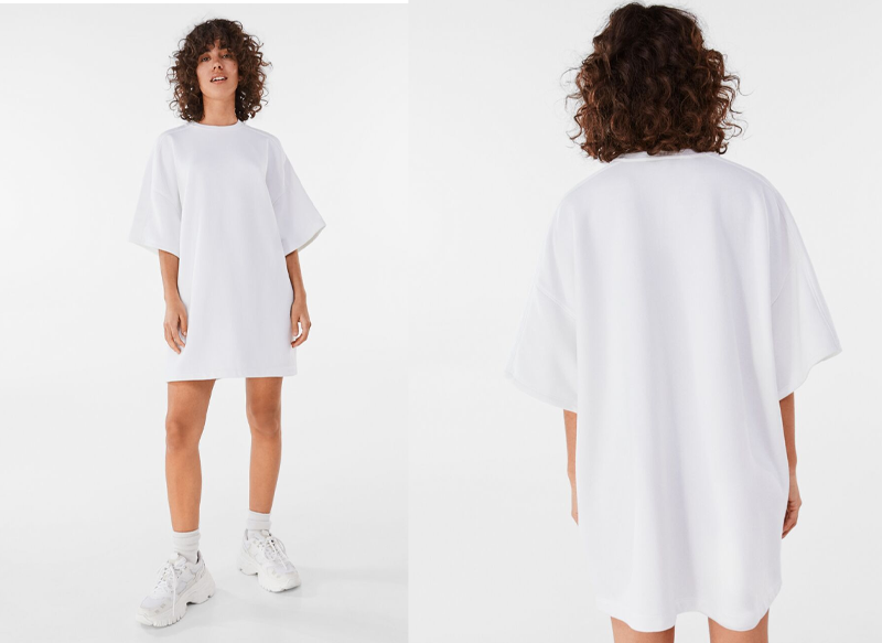 Está disponible tanto en color crudo como en gris y camel, en tallas de la XS a la L. Se encuentra fabricado en una mezcla de poliéster (50%), algodón (45%) y elastano (5%), siendo una prenda de manga corta que se caracteriza por ser amplia y corta que llega por encima de la rodilla. Su diseño la convierte en una opción perfecta para quienes buscan comodidad y un toque sport a sus looks.