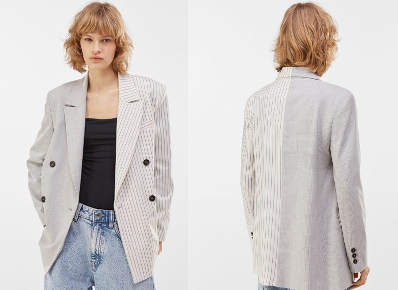En el catálogo de rebajas al 40% de Bershka podemos encontrar diseños tan curiosos y originales como esta blazer tailoring contraste bicolor. Es una blazer disponible tanto en gris como camel/crudo que destaca a simple vista por encontrarse con un diseño dividido. Por un lado nos encontramos con media blazer con acabado liso y la otra a rayass.