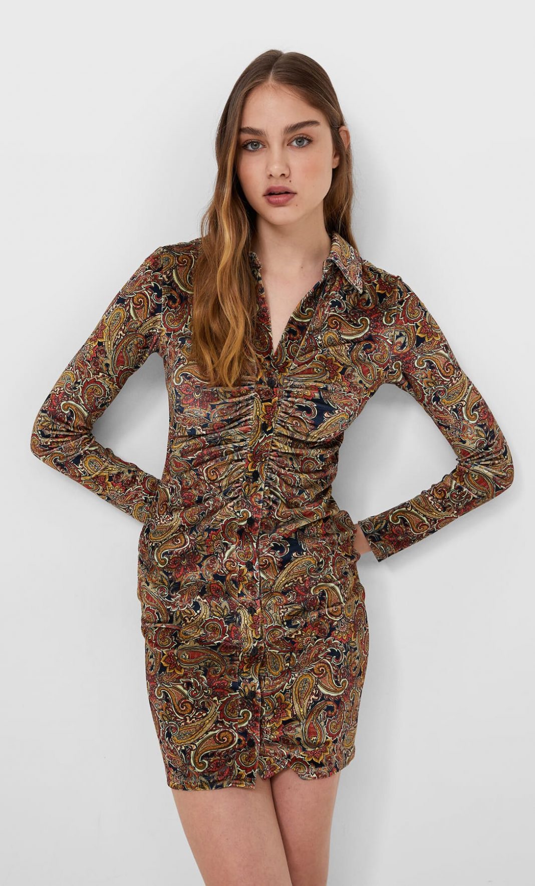 En primer lugar te presentamos este vestido fruncido de terciopelo muy elegante que te hará sobresalir cuando lo lleves puesto. Su diseño ajustado y mangas largas, te harán lucir elegante y sexi al mismo tiempo, resaltando toda tu belleza. Por otro lado, gracias a su color beige y su diseño particular es un vestido que es muy fácil de combinar con cualquier calzado. Este increíble artículo se encuentra disponible en cualquier tienda física de Stradivarius por el increíble precio de 25,99 euros en diferentes tallas. Atenta a estas otras prendas.