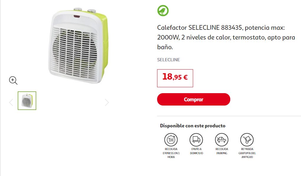Si deseas espantar el frio de la sala o de tu habitación, busca en alguna de las tienda Alcampo el Calefactor SELECLINE 883435, el cual tiene una máxima potencia de 2000 W. Adquiérelo y controla su uso, la temperatura subirá rápidamente, igual que el consumo eléctrico.